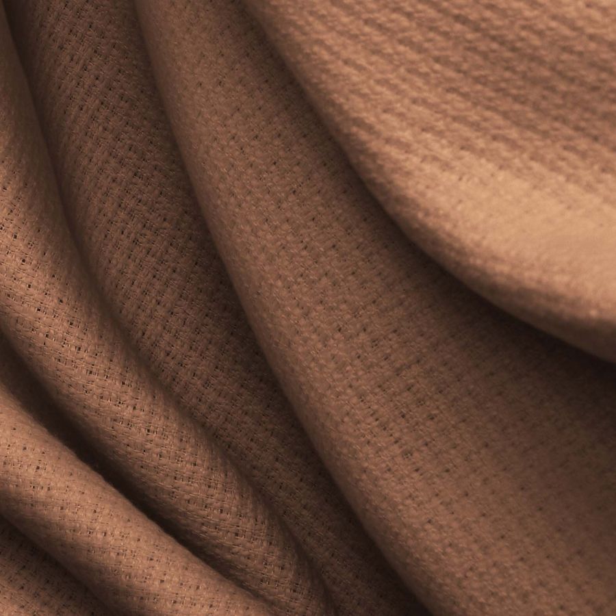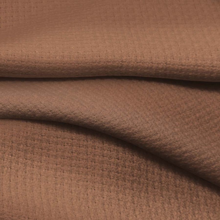 O Tweed Chanel é um tecido 100% poliéster com uma gramatura de 420 gr/m2. Sua cor lisa impressa é um marrom barro argiloso que se compõe de uma tinta Ciano: 32, Magenta: 56, Amarelo: 63 e Preto: 32 com um CMYK de 32 56 63 32. Esta cor evoca a conexão com a natureza, a terra e a estabilidade. Combina perfeitamente com uma ampla gama de tons quentes e neutros, como marrons, dourados, avermelhados e cinzas.
