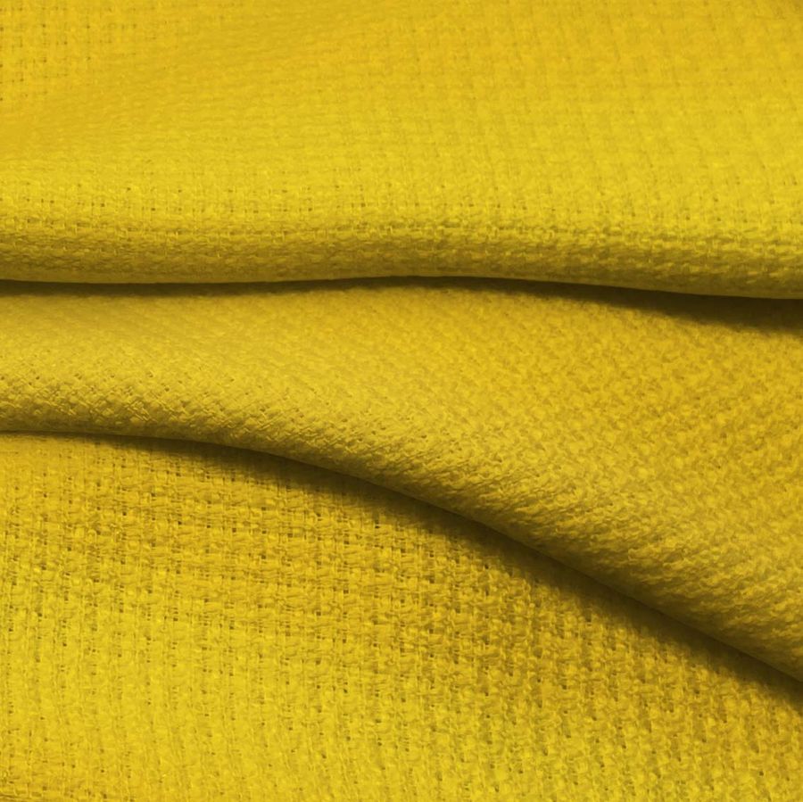 O tecido base é um Tweed-Chanel 100% poliéster de 420 gr/m2 com uma largura de 150 cm. A cor lisa impressa é um amarelo permanente com um CMYK de 6 27 91 0. A cor amarela simboliza o otimismo e a felicidade, e tecnicamente é uma cor luminosa e quente. Combina especialmente bem com outras tonalidades quentes e terrosas como os castanhos e os laranjas.