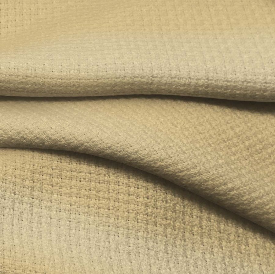 O tecido base é um tweed chanel composto por 100% poliéster, com uma gramagem de 420 gr/m2 e uma largura de 150 cm. A cor lisa do tecido impresso é um amarelo areia, representada pelos valores CMYK: 14 22 51 2. Esta cor transmite calor e naturalidade, evocando paisagens arenosas e ensolaradas. O amarelo areia combina bem com outras gamas de amarelo, marrom e verde claro, realçando a sua tonalidade quente e trazendo frescor ao conjunto.
