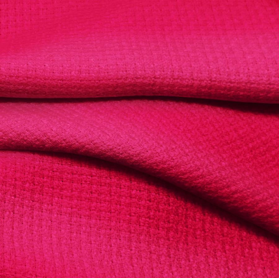 O tecido base Tweed - Chanel é um tecido de poliéster com uma gramagem de 420 gr/m2 e uma largura de 150 cm. A sua cor lisa impressa é vermelho-púrpura, com tinta ciano de 1, magenta de 100, amarelo de 57 e preto de 0, o que resulta num CMYK de 1 100 57 0. Esta cor púrpura evoca sofisticação e elegância, e combina muito bem com tons como dourado, prateado ou preto.