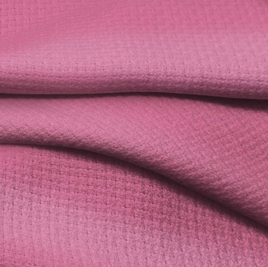 O tecido base é o Tweed de Chanel, composto 100% por poliéster com uma gramagem de 420 gr/m2 e uma largura de 150 cm. A cor lisa estampada é uma mistura de vermelho e violeta pálido com um valor CMYK de 11 68 20 0. Esta cor secundária transmite uma sensação de paixão e romance com toques de calma e tranquilidade. Combina especialmente bem com tons neutros como cinzento ou branco, assim como com tons escuros como castanho ou preto.