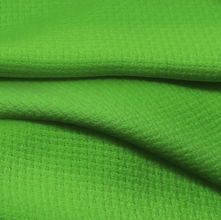 O tecido base é um Tweed - Chanel 100% poliéster, com uma gramatura de 420 gr/m2 e uma largura de 150 cm. A cor lisa impressa é um verde-papagaio, com um CMYK de 67 0 96 0. Essa cor simboliza a natureza, o frescor e a vitalidade. Tecnicamente, é uma cor intensa e luminosa, graças à alta presença de tinta amarela em sua composição. Combina especialmente bem com cores terrosas, como o marrom ou o bege, e com tons mais claros, como o branco ou o cinza claro. O tecido é impresso com a cor lisa em apenas uma face por impressão digital têxtil, o que significa que a cor é impressa apenas em uma das faces do tecido, e não é um tecido tingido.