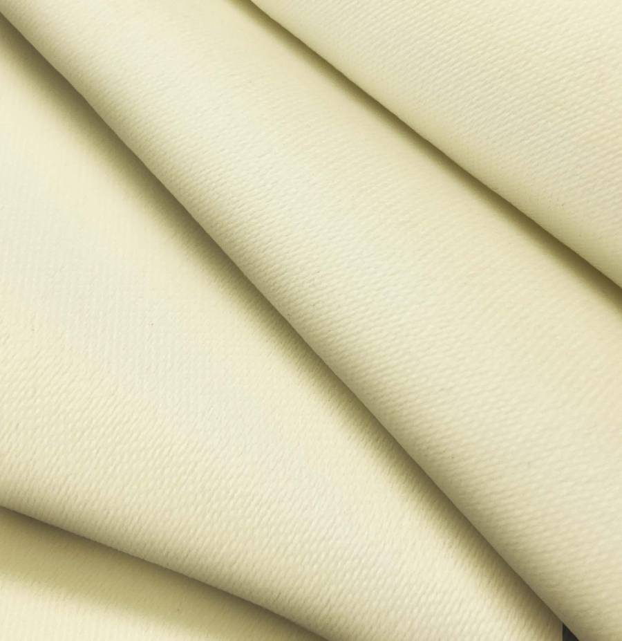 O tecido de base é Lona Oscurante - White Out, um tecido técnico 100% poliéster com uma gramatura de 218 gr/m2 e largura de 160 cm. A cor impressa é Cru/Baunilha, com uma composição CMYK de 5 8 38 0, que reflete tons suaves e quentes. Esta cor combina especialmente bem com tons terra e pastel.