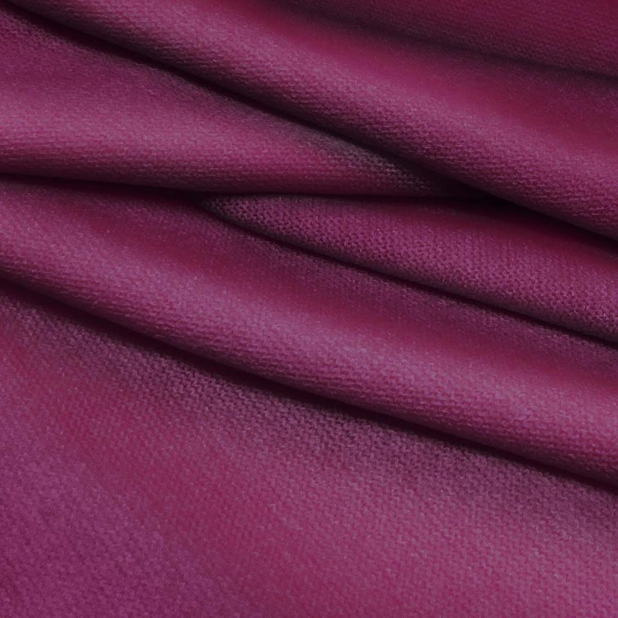 O tecido base, Malha Jersey de Toque de Algodão - Atenas, apresenta-se numa cor lisa impressa de Roxo Berinjela com um CMYK de 49 100 31 47. A cor caracteriza-se pela sua intensidade e profundidade, transmitindo uma sensação de calor e sofisticação. Este tom secundário combina na perfeição com outras cores profundas como o preto, cinzento e azul escuro, bem como com cores mais quentes como o amarelo mostarda e o vermelho queimado.