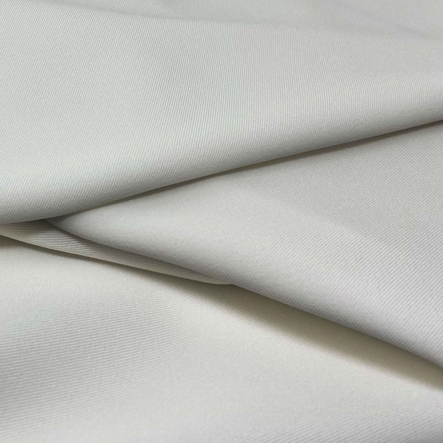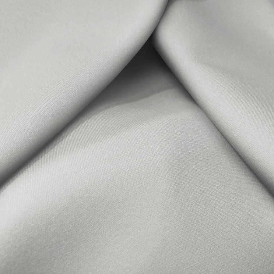 A base deste tecido é a Sarja Bielástica - Lisboa, composta por 97% poliéster e 3% elastano, com gramatura de 209 gr/m2 e largura de 150 cm. A cor lisa impressa é um Cinza Nuvem, cujo CMYK é 20 12 17 0, o que indica que é um tom neutro e suave, com um leve toque de ciano e magenta. Combina bem com cores como branco, preto, azul escuro e verde escuro.
