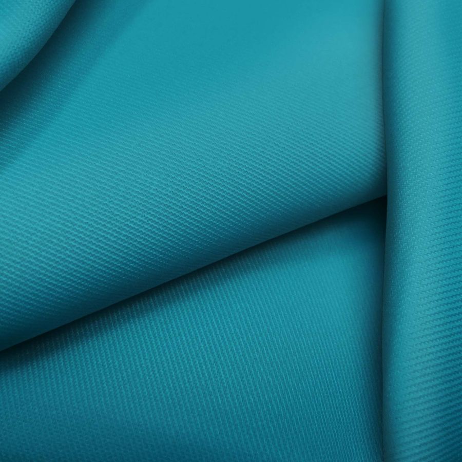 O tecido base é uma sarja de poliéster com 4% de elastano, com gramatura de 220 gr/m2 e largura de 150 cm. A cor lisa estampada é um azul hosta com CMYK de 83 30 33 11. Este tom de azul é uma mistura de ciano e magenta em proporção predominante, com um toque de amarelo e preto que proporciona profundidade e contraste à cor. Esta cor combina bem com tons terrosos, verdes suaves, laranja e amarelo claro.