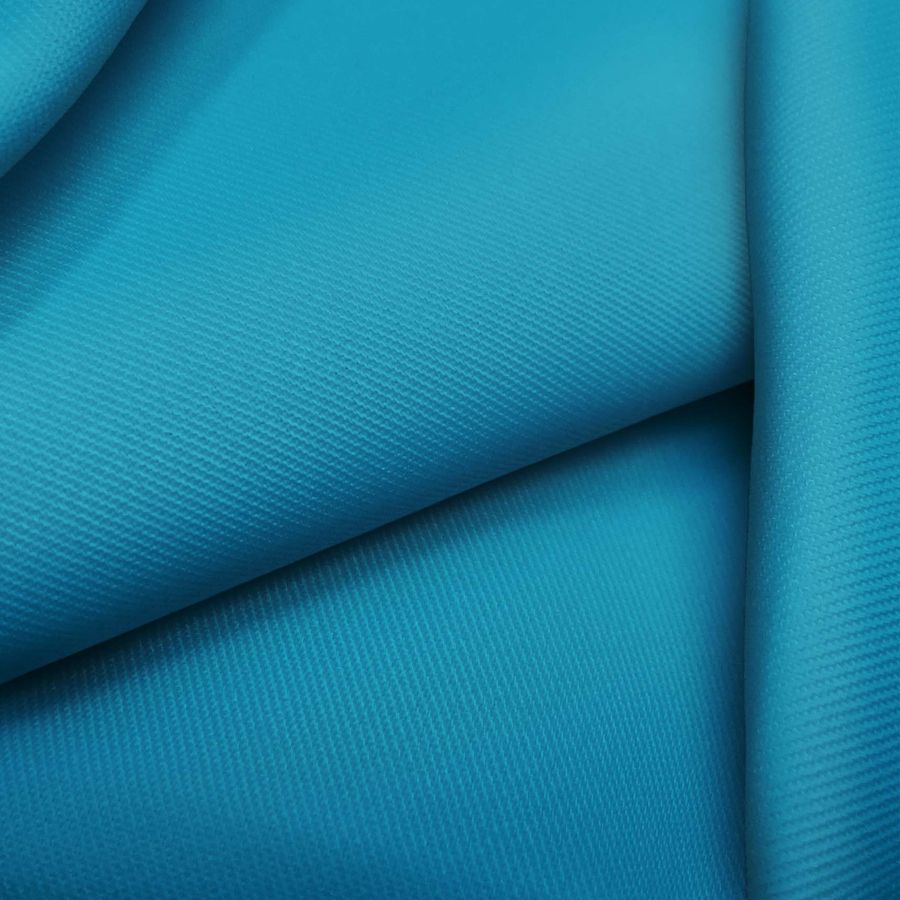 O tecido base é a sarja Prada, composta por 96% de poliéster e 4% de elastano, com gramatura de 220 gr/m2 e largura de 150 cm. A cor lisa estampada é um belo tom azul-heras com um conteúdo CMYK de 82 31 22 5. Esta cor secundária é simbólica de frescor e rejuvenescimento, e combina particularmente bem com tons nude, verdes e dourados. É importante notar que o tecido é estampado em um único lado por impressão digital têxtil.