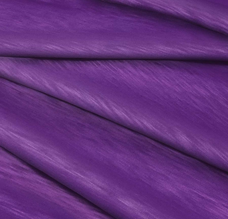 O tecido base é o Punto Camiseta Jaspeado - Dubái, um tecido de malha com composição 100% poliéster e gramatura de 135 gr/m2. Sua largura é de 160 cm e possui diversas características, como textura lisa e suave ao toque, aspecto visual translúcido e jaspeado, e elasticidade que proporciona maior flexibilidade em seu uso. A cor secundária impressa neste tecido é o Roxo Íris, que tem um CMYK de 75 94 15 5. Esta cor é um tom vibrante de roxo que lembra uma flor de íris. Combina muito bem com tons neutros como preto, branco e cinza, assim como com tons de rosa e azul. É importante ressaltar que o tecido é impresso com a cor lisa em uma única face por impressão digital têxtil, o que significa que a cor é impressa em uma única face do tecido e não está tingida em todo o material.