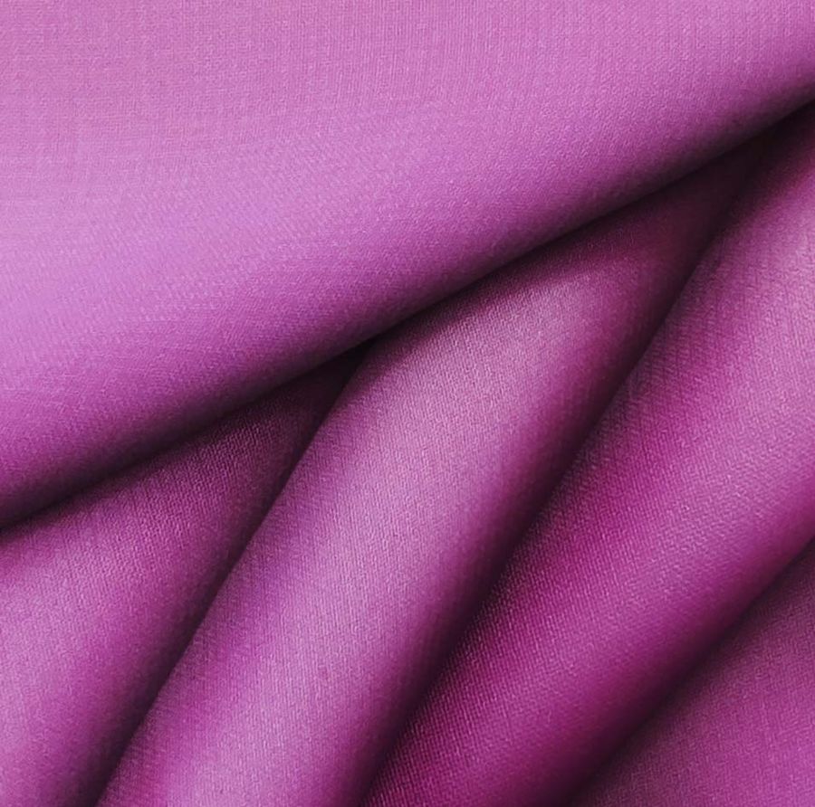O tecido base é a Gaze Transparente - Salamanca, composta por 100% poliéster e com uma gramatura de 28 gr/m2. A cor lisa impressa é uma combinação de roxo e ameixa rosa, refletida em um CMYK de 38 87 2 0. Esta cor secundária combina muito bem com tons neutros como o branco e o preto.