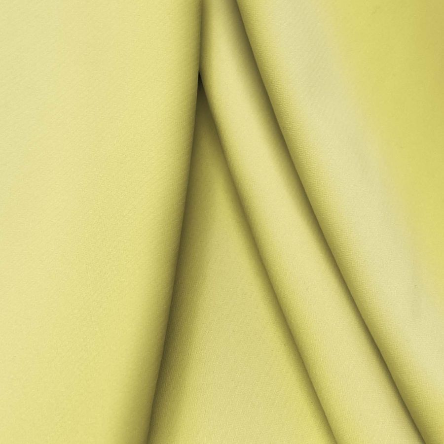 O tecido base é o Ponto Sintético com Spandex - Suporte e sua cor lisa estampada é um amarelo intenso, com tinta ciano de 4, tinta magenta de 3, tinta amarela de 64 e tinta preta de 0, com um CMYK de 4 3 64 0. Esta cor primaveril destaca-se pela sua alegria e vitalidade, sendo perfeita para peças de verão. Combina perfeitamente com tons pastel e neutros, como cinza ou branco, para um contraste fresco e sofisticado.