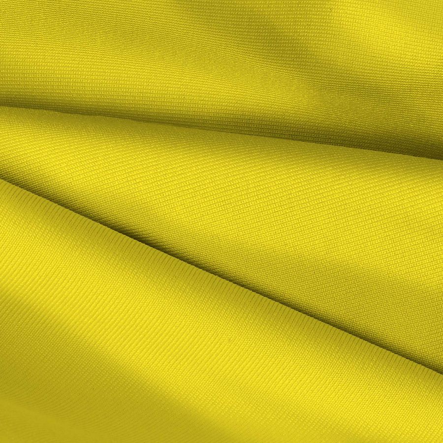 O tecido base é Lycra de Poliéster - Nairobi de 270 gr/m2, com uma composição de 82% poliéster e 18% elastano, em uma largura de 150 cm. Sua cor lisa impressa é Amarelo Sólido, com um CMYK de 3 2 88 0. Esta cor vibrante evoca o sol e o verão, e combina bem com tons verdes e azuis.