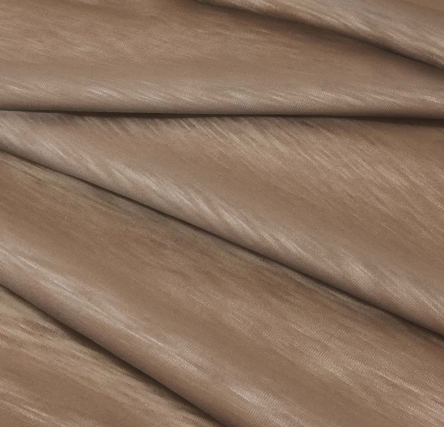 O tecido base utilizado neste caso é o Malha Jersey Jaspeada - Dubai, um tecido de malha com composição 100% poliéster, gramatura de 135 gr/m2 e largura de 160 cm. A cor lisa estampada neste tecido é um marrom com tons de noz, com CMYK de 36 47 53 31 e é estampado em uma única face por meio de impressão digital têxtil.