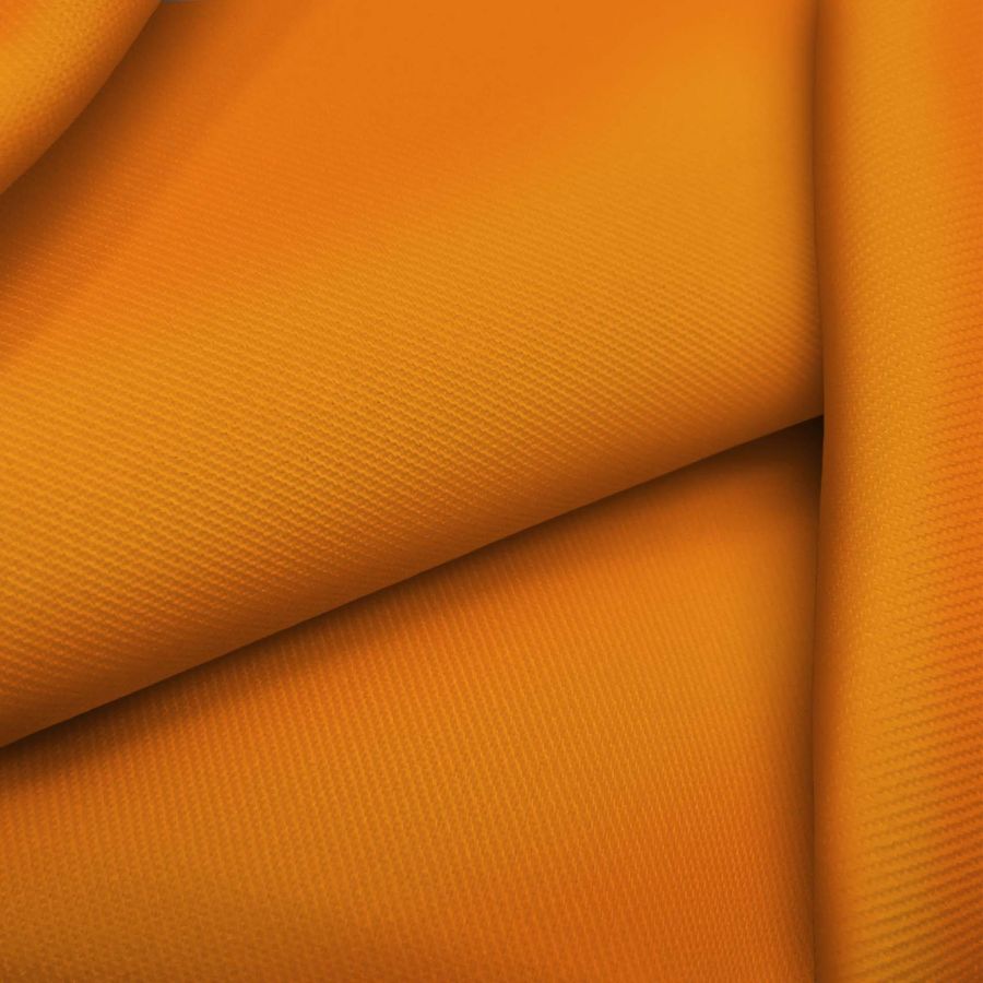 A base do tecido é uma sarja de poliéster e elastano, com gramatura de 220 gr/m2 e largura de 150cm. A cor sólida impressa é laranja caranguejo, com CMYK 0 64 91 0. Este tom é caracterizado por sua vitalidade, energia e dinamismo, simbolizando otimismo e alegria. Além disso, combina perfeitamente com tons análogos como amarelo e vermelho, bem como com cores complementares como azul ou verde. O tecido é impresso com a cor sólida em uma única face, por impressão digital têxtil. A textura do tecido é macia e fina, o que o torna ideal para a confecção de peças de moda masculina e feminina, como camisas, saias, blusas, vestidos e lenços. Além disso, seu tecido flexível e resistente permite a confecção de acessórios como bolsas ou mochilas. Os cuidados recomendados para este tecido incluem não alvejar, lavar a uma temperatura máxima de 30ºC, permite lavagem a seco exceto com tricloroetileno, passar a ferro em baixa temperatura e evitar a secadora. A tecnologia de impressão utilizada é a sublimação sobre poliéster, que permite a fixação da tinta na fibra e um resultado de alta qualidade e duradouro.
