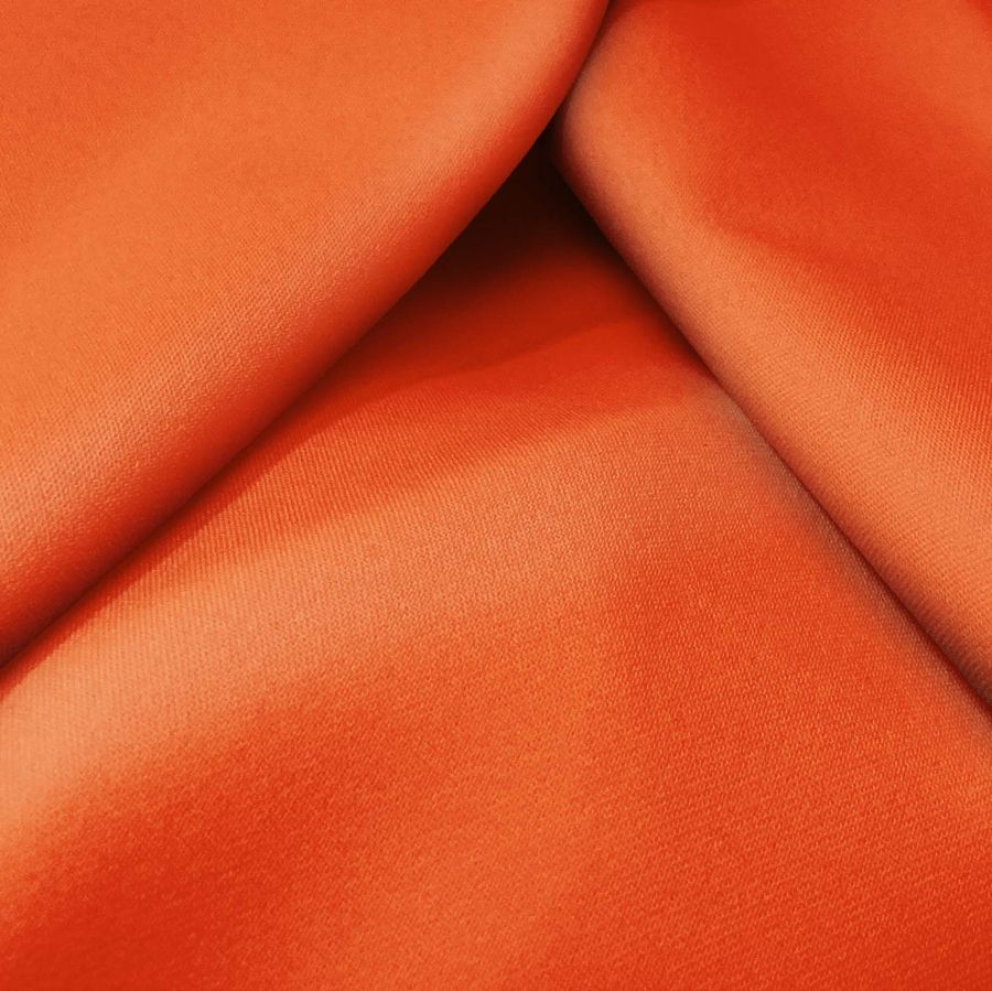 O tecido base Sarja Bielástica - Lisboa tem uma composição de 97% poliéster e 3% elastano, com gramatura de 209 gr/m2 e largura de 150 cm. A cor lisa estampada é Laranja Puro, com um CMYK de 0 82 94 0. Essa cor é vibrante e alegre, evocando a vitalidade e a energia do sol. Combina bem com tons terrosos, como marrom ou bege, assim como com tons mais suaves, como cinza ou preto.