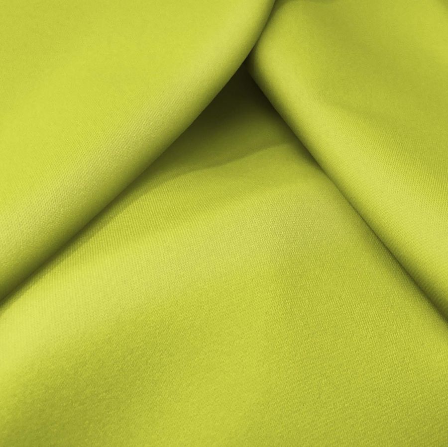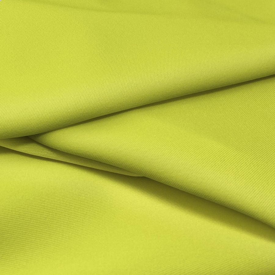 O tecido base é a Sarja Bielástica-Lisboa, composta por 97% poliéster e 3% elastano, com gramagem de 209 gr/m2 e largura de 150cm. A cor lisa estampada é amarelo-limão com um CMYK de 23 0 80 0, e é impressa digitalmente apenas de um lado. O tecido tem uma textura áspera, elástica e macia ao toque. A cor amarelo-limão simboliza iluminação, energia e frescura. É uma cor vibrante e alegre que combina bem com tons pastel suaves e tons terra quentes.