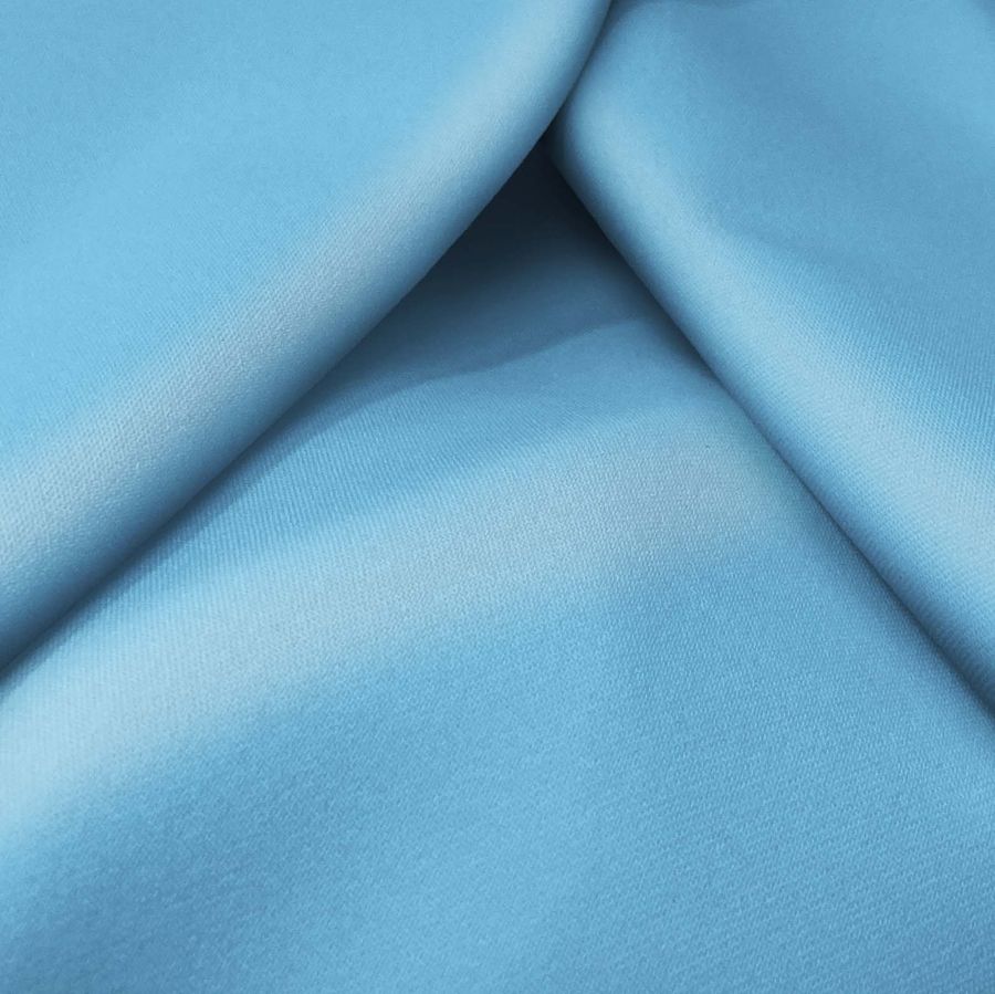 O tecido base, Sarja Bielástica - Lisboa, é composto por 97% poliéster e 3% elastano, tem um peso de 209 gr/m2 e uma largura de 150 cm. A cor lisa estampada, Azul Frita, tem um CMYK de 53 11 0 0 e é um tom de azul profundo com uma nuance acinzentada, que combina bem com tons terrosos e amarelos. O tecido é estampado com a cor lisa de um lado por impressão digital têxtil.